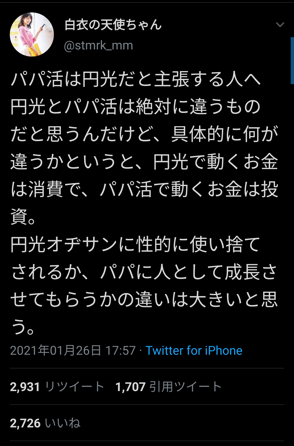 【悲報】パパ活女子さん、うり呼ばわりしてくる陰キャ貧乏人を完全論破してしまうw 2021年01月30日 カテゴリ:雑談・面白ネタ・VIP・なんj 【オススメ記事】1: 名無しの太郎 2021/01/29(金) 17:51:08.42 ID:GM3vN9tx0NIKU https://twitter.com/stmrk_mm/status/1353990543164854273?s=19 白衣の天使ちゃん @stmrk_mm パパ活は円光だと主張する人へ 円光とパパ活は絶対に違うものだと思うんだけど、具体的に何が違うかというと、円光で動くお金は消費で、パパ活で動くお金は投資。 円光オヂサンに性的に使い捨てされるか、パパに人として成長させてもらうかの違いは大きいと思う。 https://twitter.com/5chan_nel (5ch newer account) 【【悲報】パパ活女子さん、うり呼ばわりしてくる陰キャ貧乏人を完全論破してしまうw】の続きを読む