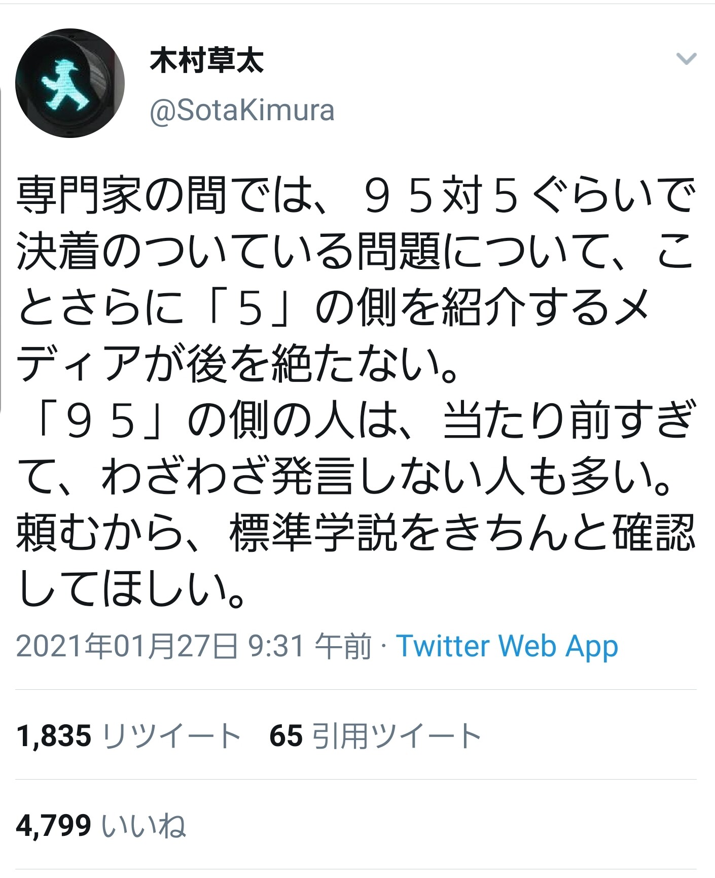 【悲報】大学教授「専門家の間で95対5で決着のついてる問題に、『5』の側を紹介するメディア多すぎ」 2021年01月29日 カテゴリ:雑談・面白ネタ・VIP・なんj 【オススメ記事】1: 名無しの太郎 2021/01/28(木) 01:44:37.32 ID:5bnuPFGTa 専門家の間では、95対5ぐらいで決着のついている問題について、ことさらに「5」の側を紹介するメディアが後を絶たない。 「95」の側の人は、当たり前すぎて、わざわざ発言しない人も多い。頼むから、標準学説をきちんと確認してほしい。 【【悲報】大学教授「専門家の間で95対5で決着のついてる問題に、『5』の側を紹介するメディア多すぎ」】の続きを読む