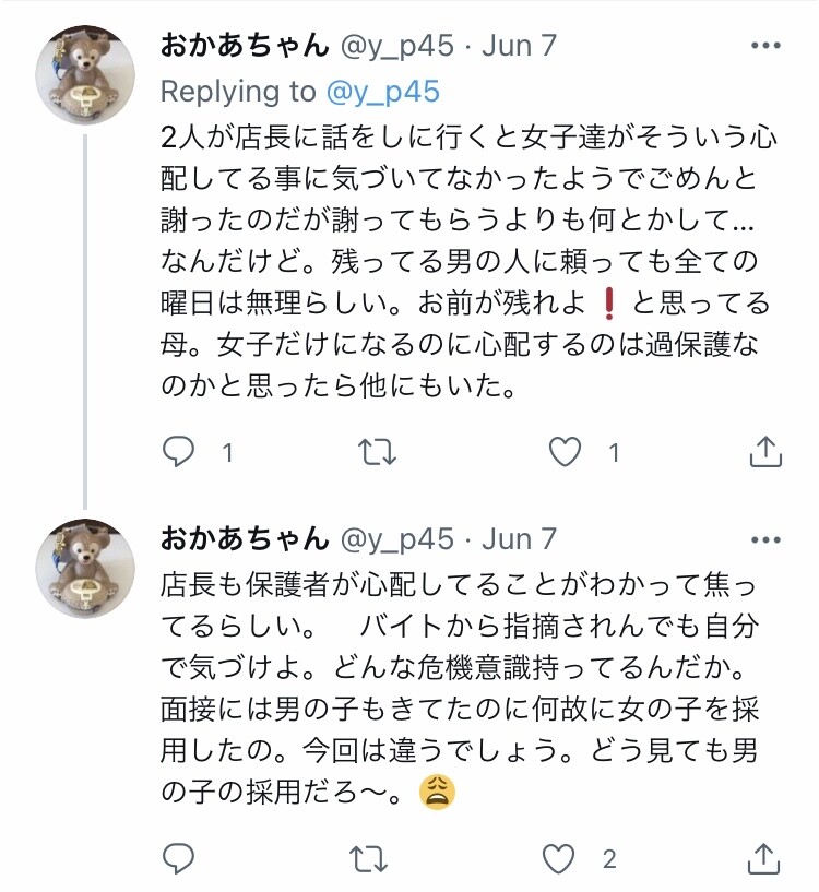 【悲報】まんさん「娘のバイト先の店長ありえない。女の子だけで夜のシフト組ませるなんて!」 2021年12月29日 カテゴリ:雑談・面白ネタ・VIP・なんj 【オススメ記事】1: 名無しの太郎 2021/12/29(水) 11:12:09.90 ID:PgExd+IU0 【【悲報】まんさん「娘のバイト先の店長ありえない。女の子だけで夜のシフト組ませるなんて!」】の続きを読む