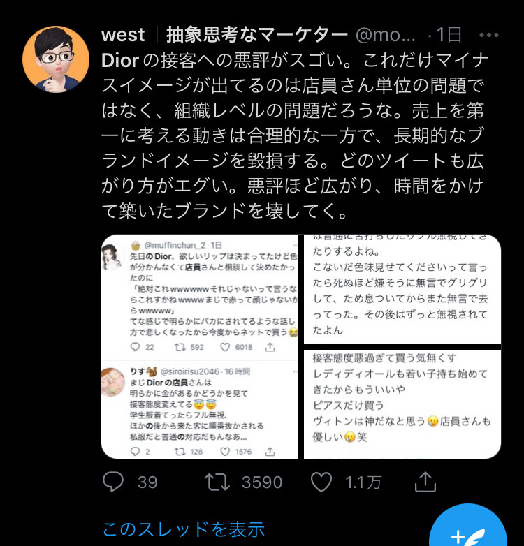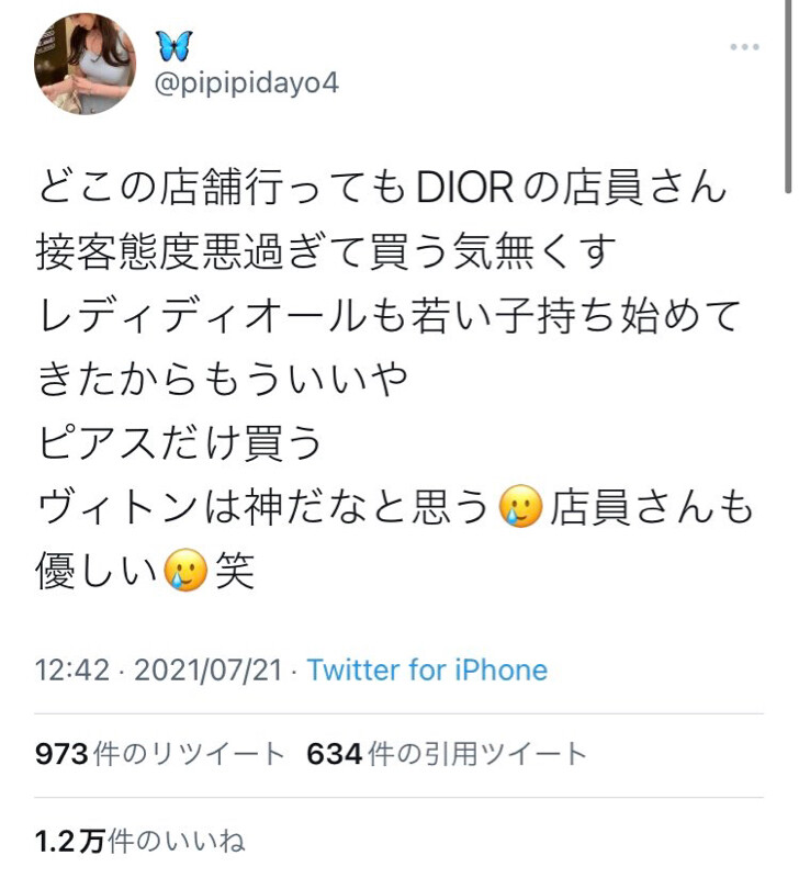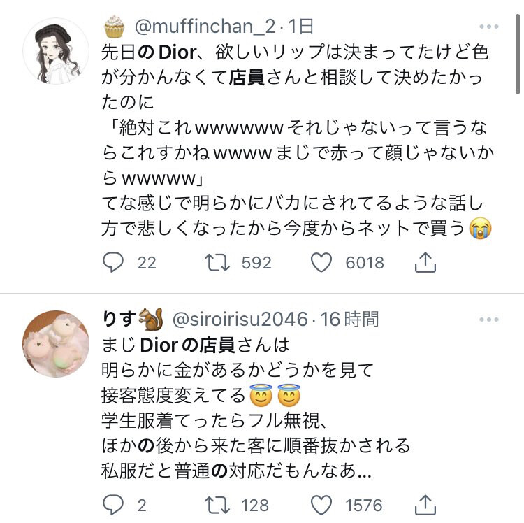 【画像】高級化粧ブランド「Dior」の接客が炎上中。Twitter「学生服で行ったら舐められた」 2021年12月19日 カテゴリ:雑談・面白ネタ・VIP・なんj 【オススメ記事】1: 名無しの太郎 2021/12/17(金) 11:29:39.02 ID:/XCUG6+1d 【【画像】高級化粧ブランド「Dior」の接客が炎上中。Twitter「学生服で行ったら舐められた」】の続きを読む