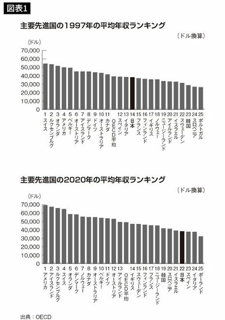 【画像】主要先進国の平均年収ランキングがコレ。日本は堂々の22位 2021年12月18日 カテゴリ:雑談・面白ネタ・VIP・なんj海外ネタ 【オススメ記事】1: 名無しの太郎 2021/12/16(木) 23:54:06.54 ID:kODFl9pe0 BE:271912485-2BP(1500) sssp://img.5ch.net/ico/nida.gif ソース これだけ必しにこいて働いているのに 遊びまくりのイタリア、スペイン並み… 「平均年収は韓国以下」日本人の給料がちっとも上がらない決定的な理由 https://news.yahoo.co.jp/articles/1f5ac9bc62dd5272fe73c8620544798d067e854b 【【画像】主要先進国の平均年収ランキングがコレ。日本は堂々の22位】の続きを読む
