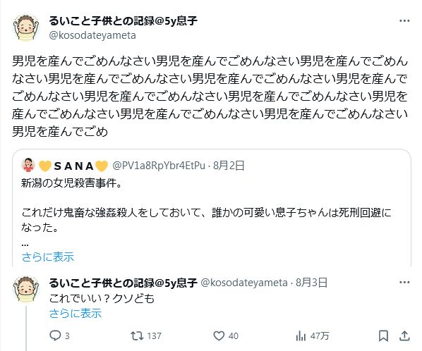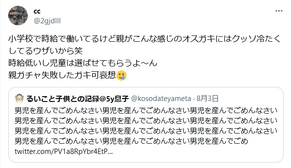 子持ち「ツイフェミさん、男児産んでごめんなさい。これでいい?w」無産様「……!!!!」ブチィッ!!! 2023年12月31日 【オススメ記事ピックアップ!】・有名モデル「野球って勝手にルール作って、勝手にやって、勝手に盛り上がってすごいねって」・【画像】けん玉日本一になった女子中学生・【悲報】恋愛もう上位10%の男しか出来なくなる・【悲報】中国父さん、「ドラゴンボール」の起源を主張してしまうwwwwwwwwwwwww・テレビ局「Z世代どうしてテレビ見ないの?」Z世代「だってテレビ持ってないし」・【画像】 僕やばの姉、かわいすぎるwwwwwwwwwwwwwwwwwwwwwwww ・ 【画像】 米軍「おい自衛隊、演習で我々が守ってる街を奪還してみろ」ジャップ自衛隊「おかのした」・【悲報】 木村沙織の(夫の接客態度が最悪すぎて口コミ評価がひどすぎる)カフェ、閉店・【悲報】 学校のリーダーズとかいうアイドルwwwwwwwwww・ 【速報】 中将ガープさん、黒ひげ海賊団にリンチされて死亡・ 【超絶速報】 岸田「奨学金に課税するぞ~」 ・ 【朗報】 ルフィ、黄猿を捕獲するwwww1: 名無しの太郎 2023/12/30(土) 19:45:18.84 ID:N2lI065a0 延々男児を叩いているツイフェミ垢 https://twitter.com/PV1a8RpYbr4EtPu それを見た母親「男児産んでごめんなさい。これでいい?w」 無産の群れ、なぜかブチギレ 「謝ればいいと思ってる!!!」 「学童に務めてるけどオスガキは冷たくする!!!」 ちな発言してるのは独身昭和世代と子供に加害する非正規 https://twitter.com/thejimwatkins 【子持ち「ツイフェミさん、男児産んでごめんなさい。これでいい?w」無産様「……!!!!」ブチィッ!!!】の続きを読む