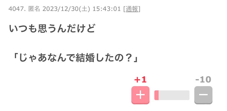 ガルちゃん民「旦那の実家がさあ!」 人「じゃあなんで結婚したの?」 ガルちゃん民「スゥーッ・・・」 2023年12月31日 【オススメ記事ピックアップ!】・有名モデル「野球って勝手にルール作って、勝手にやって、勝手に盛り上がってすごいねって」・【画像】けん玉日本一になった女子中学生・【悲報】恋愛もう上位10%の男しか出来なくなる・【悲報】中国父さん、「ドラゴンボール」の起源を主張してしまうwwwwwwwwwwwww・テレビ局「Z世代どうしてテレビ見ないの?」Z世代「だってテレビ持ってないし」・【画像】 僕やばの姉、かわいすぎるwwwwwwwwwwwwwwwwwwwwwwww ・ 【画像】 米軍「おい自衛隊、演習で我々が守ってる街を奪還してみろ」ジャップ自衛隊「おかのした」・【悲報】 木村沙織の(夫の接客態度が最悪すぎて口コミ評価がひどすぎる)カフェ、閉店・【悲報】 学校のリーダーズとかいうアイドルwwwwwwwwww・ 【速報】 中将ガープさん、黒ひげ海賊団にリンチされて死亡・ 【超絶速報】 岸田「奨学金に課税するぞ~」 ・ 【朗報】 ルフィ、黄猿を捕獲するwwww1: 名無しの太郎 2023/12/30(土) 16:10:15.88 ID:9xn6hz0JM 【ガルちゃん民「旦那の実家がさあ!」 人「じゃあなんで結婚したの?」 ガルちゃん民「スゥーッ・・・」】の続きを読む