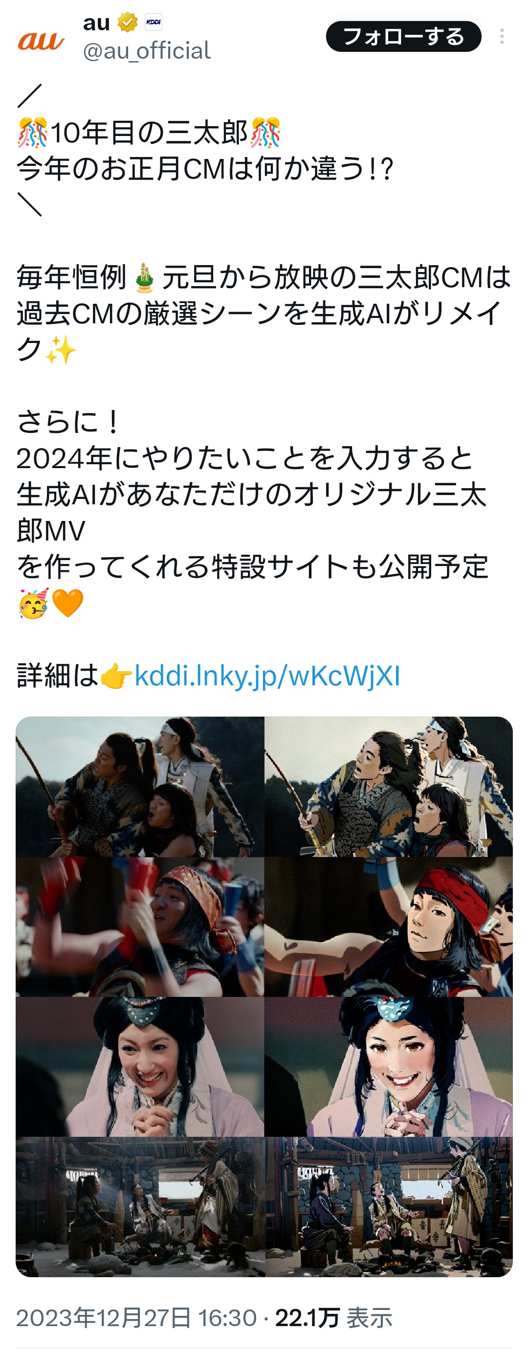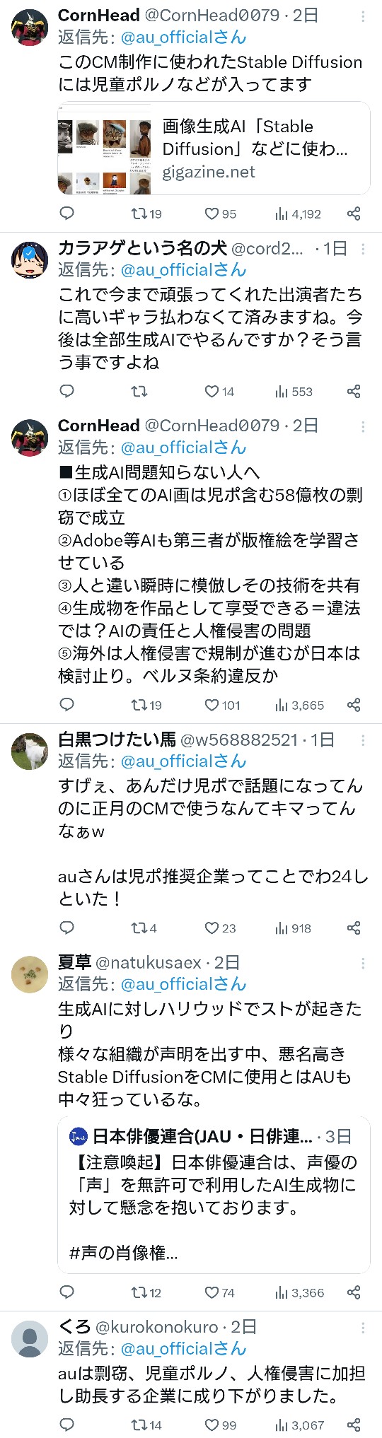 【悲報】au、AI生成に手を出し炎上する 2023年12月30日 【オススメ記事ピックアップ!】・有名モデル「野球って勝手にルール作って、勝手にやって、勝手に盛り上がってすごいねって」・【画像】けん玉日本一になった女子中学生・【悲報】恋愛もう上位10%の男しか出来なくなる・【悲報】中国父さん、「ドラゴンボール」の起源を主張してしまうwwwwwwwwwwwww・テレビ局「Z世代どうしてテレビ見ないの?」Z世代「だってテレビ持ってないし」・【画像】 僕やばの姉、かわいすぎるwwwwwwwwwwwwwwwwwwwwwwww ・ 【画像】 米軍「おい自衛隊、演習で我々が守ってる街を奪還してみろ」ジャップ自衛隊「おかのした」・【悲報】 木村沙織の(夫の接客態度が最悪すぎて口コミ評価がひどすぎる)カフェ、閉店・【悲報】 学校のリーダーズとかいうアイドルwwwwwwwwww・ 【速報】 中将ガープさん、黒ひげ海賊団にリンチされて死亡・ 【超絶速報】 岸田「奨学金に課税するぞ~」 ・ 【朗報】 ルフィ、黄猿を捕獲するwwww1: 名無しの太郎 2023/12/30(土) 07:55:14.89 ID:dKzbukvrr あーあ 【【悲報】au、AI生成に手を出し炎上する】の続きを読む