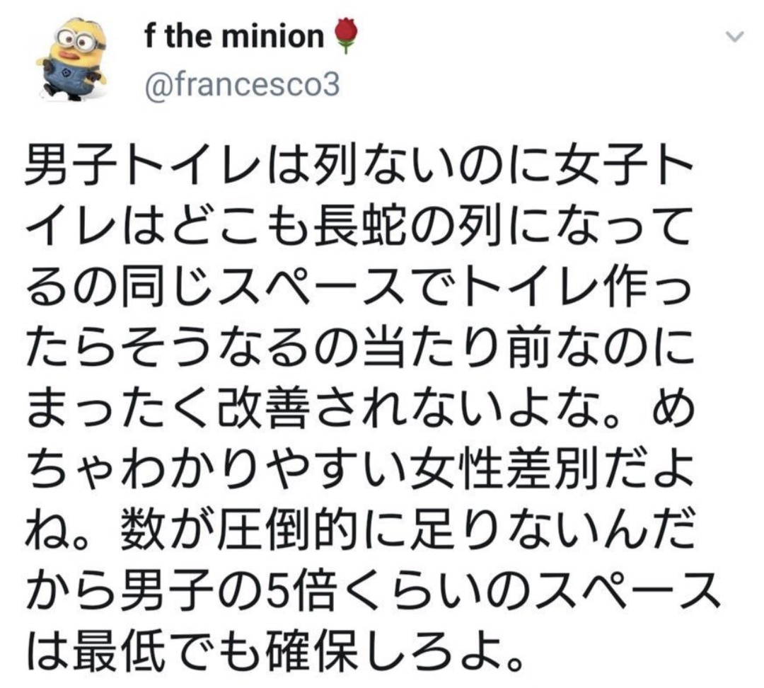【悲報】X女性「女子トイレだけ行列が出来るのは女性差別、女子トイレは男性トイレの5倍に増やすべき」 2024年01月30日 【オススメ記事ピックアップ!】・有名モデル「野球って勝手にルール作って、勝手にやって、勝手に盛り上がってすごいねって」・【画像】けん玉日本一になった女子中学生・【悲報】恋愛もう上位10%の男しか出来なくなる・【悲報】中国父さん、「ドラゴンボール」の起源を主張してしまうwwwwwwwwwwwww・テレビ局「Z世代どうしてテレビ見ないの?」Z世代「だってテレビ持ってないし」・【画像】 僕やばの姉、かわいすぎるwwwwwwwwwwwwwwwwwwwwwwww ・ 【画像】 米軍「おい自衛隊、演習で我々が守ってる街を奪還してみろ」ジャップ自衛隊「おかのした」・【悲報】 木村沙織の(夫の接客態度が最悪すぎて口コミ評価がひどすぎる)カフェ、閉店・【悲報】 学校のリーダーズとかいうアイドルwwwwwwwwww・ 【速報】 中将ガープさん、黒ひげ海賊団にリンチされて死亡・ 【超絶速報】 岸田「奨学金に課税するぞ~」 ・ 【朗報】 ルフィ、黄猿を捕獲するwwww1: 名無しの太郎 2024/01/30(火) 07:00:24.313 ID:ei3a/TFua 【【悲報】X女性「女子トイレだけ行列が出来るのは女性差別、女子トイレは男性トイレの5倍に増やすべき」】の続きを読む