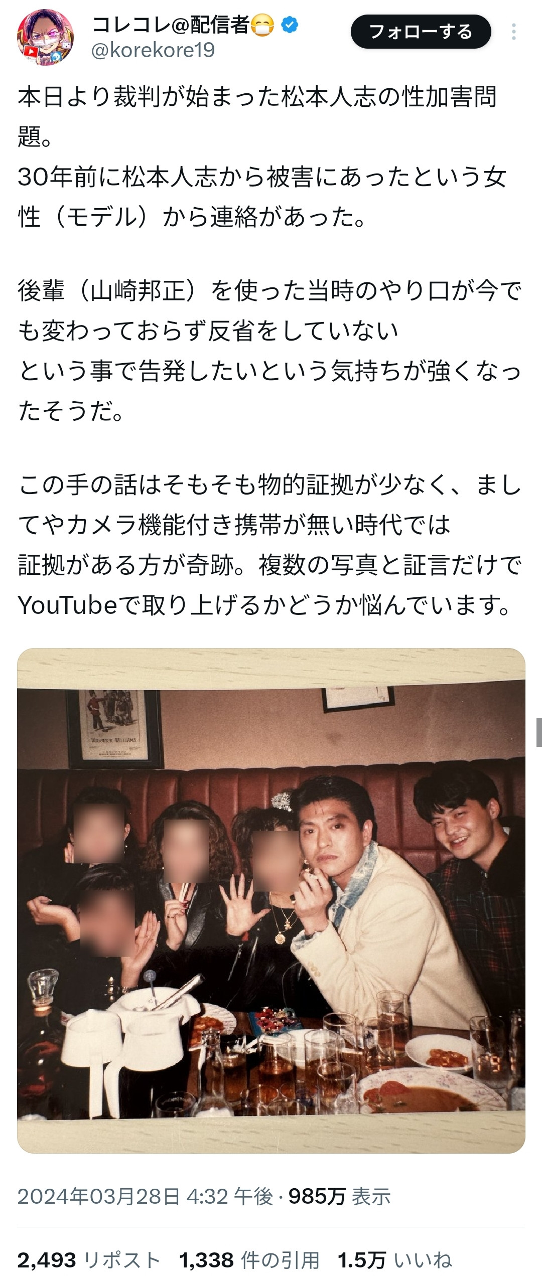 【悲報】松本人志さん、遂にコレコレに画像の証拠付きで暴露されて終わる 2024年03月30日 1: 名無しの太郎 2024/03/29(金) 18:32:17.71 ID:7HPd8SBo0NIKU 【オススメ記事ピックアップ!】・有名モデル「野球って勝手にルール作って、勝手にやって、勝手に盛り上がってすごいねって」・【画像】けん玉日本一になった女子中学生・【悲報】恋愛もう上位10%の男しか出来なくなる・【悲報】中国父さん、「ドラゴンボール」の起源を主張してしまうwwwwwwwwwwwww・テレビ局「Z世代どうしてテレビ見ないの?」Z世代「だってテレビ持ってないし」・【画像】 僕やばの姉、かわいすぎるwwwwwwwwwwwwwwwwwwwwwwww ・ 【画像】 米軍「おい自衛隊、演習で我々が守ってる街を奪還してみろ」ジャップ自衛隊「おかのした」・【悲報】 木村沙織の(夫の接客態度が最悪すぎて口コミ評価がひどすぎる)カフェ、閉店・【悲報】 学校のリーダーズとかいうアイドルwwwwwwwwww・ 【速報】 中将ガープさん、黒ひげ海賊団にリンチされて死亡・ 【超絶速報】 岸田「奨学金に課税するぞ~」 ・ 【朗報】 ルフィ、黄猿を捕獲するwwww 【【悲報】松本人志さん、遂にコレコレに画像の証拠付きで暴露されて終わる】の続きを読む