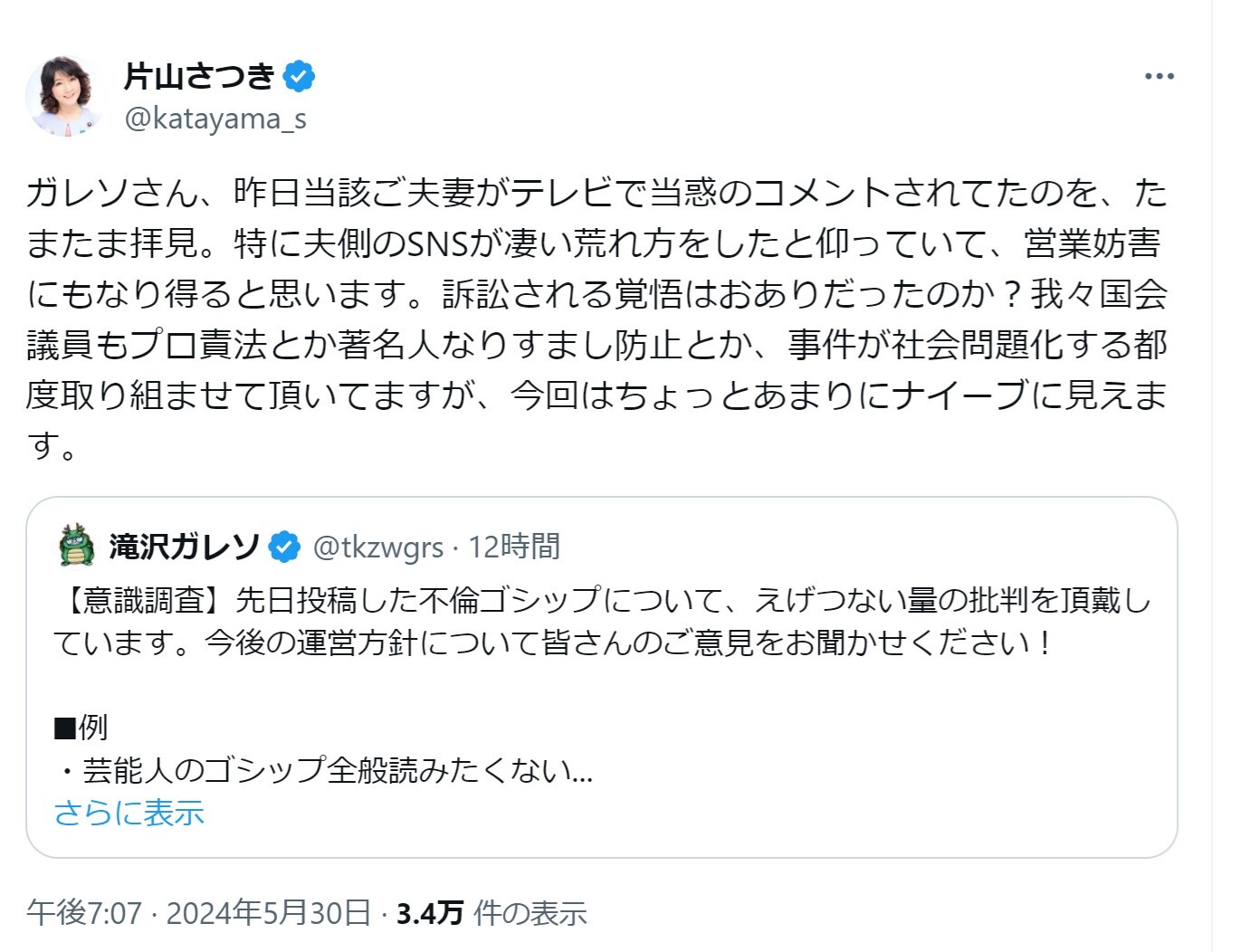【悲報】滝沢ガレソさん、ついに政治家も問題視し始める・・・ 2024年05月31日 1: 名無しの太郎 2024/05/30(木) 22:10:58.12 ID:joqrZ+1Y0 残当 【オススメ記事ピックアップ!】・有名モデル「野球って勝手にルール作って、勝手にやって、勝手に盛り上がってすごいねって」・【画像】けん玉日本一になった女子中学生・【悲報】恋愛もう上位10%の男しか出来なくなる・【悲報】中国父さん、「ドラゴンボール」の起源を主張してしまうwwwwwwwwwwwww・テレビ局「Z世代どうしてテレビ見ないの?」Z世代「だってテレビ持ってないし」・【画像】 僕やばの姉、かわいすぎるwwwwwwwwwwwwwwwwwwwwwwww ・ 【画像】 米軍「おい自衛隊、演習で我々が守ってる街を奪還してみろ」ジャップ自衛隊「おかのした」・【悲報】 木村沙織の(夫の接客態度が最悪すぎて口コミ評価がひどすぎる)カフェ、閉店・【悲報】 学校のリーダーズとかいうアイドルwwwwwwwwww・ 【速報】 中将ガープさん、黒ひげ海賊団にリンチされて死亡・ 【超絶速報】 岸田「奨学金に課税するぞ~」 ・ 【朗報】 ルフィ、黄猿を捕獲するwwww 【【悲報】滝沢ガレソさん、ついに政治家も問題視し始める・・・】の続きを読む