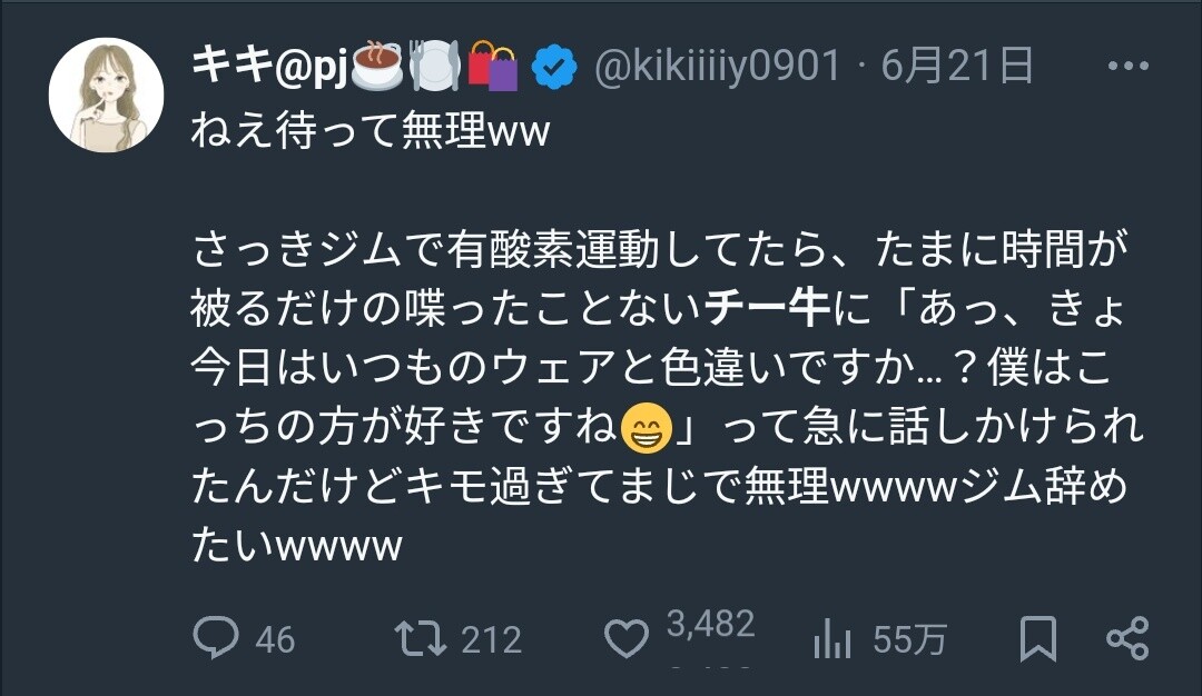 【悲報】「えっ待って!ジムでチ―牛に話しかけられた…もう行けない😭」4万いいね 2024年06月23日 1: 名無しの太郎 2024/06/23(日) 02:34:20.08 ID:Acueo2JWr 【オススメ記事ピックアップ!】・有名モデル「野球って勝手にルール作って、勝手にやって、勝手に盛り上がってすごいねって」・【画像】けん玉日本一になった女子中学生・【悲報】恋愛もう上位10%の男しか出来なくなる・【悲報】中国父さん、「ドラゴンボール」の起源を主張してしまうwwwwwwwwwwwww・テレビ局「Z世代どうしてテレビ見ないの?」Z世代「だってテレビ持ってないし」・【画像】 僕やばの姉、かわいすぎるwwwwwwwwwwwwwwwwwwwwwwww ・ 【画像】 米軍「おい自衛隊、演習で我々が守ってる街を奪還してみろ」ジャップ自衛隊「おかのした」・【悲報】 木村沙織の(夫の接客態度が最悪すぎて口コミ評価がひどすぎる)カフェ、閉店・【悲報】 学校のリーダーズとかいうアイドルwwwwwwwwww・ 【速報】 中将ガープさん、黒ひげ海賊団にリンチされて死亡・ 【超絶速報】 岸田「奨学金に課税するぞ~」 ・ 【朗報】 ルフィ、黄猿を捕獲するwwww 【【悲報】「えっ待って!ジムでチ―牛に話しかけられた…もう行けない😭」4万いいね】の続きを読む