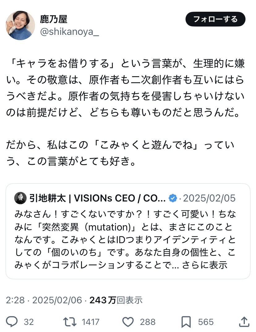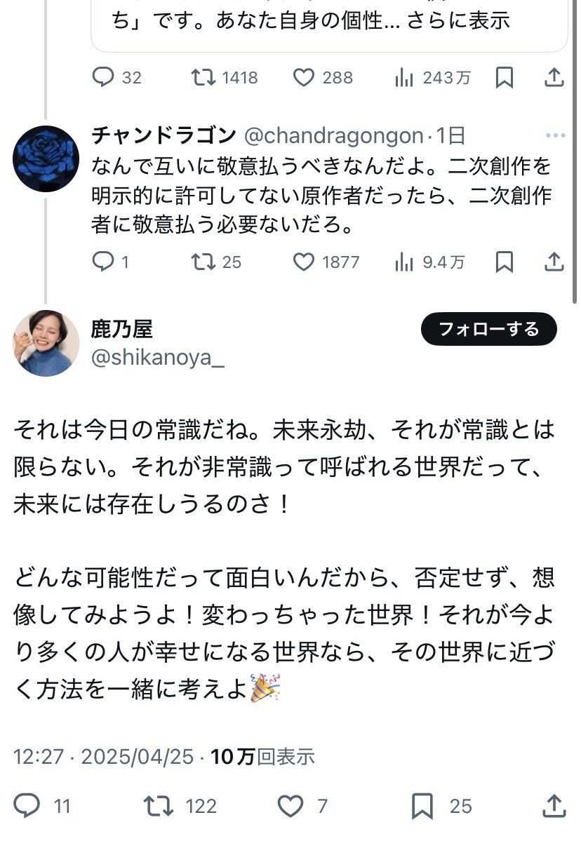 【悲報】コスプレイヤー「キャラを借りるって言葉が嫌い。原作者もこちらに敬意を払うべき」 2025年04月26日 【オススメ記事ピックアップ!】・有名モデル「野球って勝手にルール作って、勝手にやって、勝手に盛り上がってすごいねって」・【画像】けん玉日本一になった女子中学生・【悲報】恋愛もう上位10%の男しか出来なくなる・【悲報】中国父さん、「ドラゴンボール」の起源を主張してしまうwwwwwwwwwwwww・テレビ局「Z世代どうしてテレビ見ないの?」Z世代「だってテレビ持ってないし」・【画像】 僕やばの姉、かわいすぎるwwwwwwwwwwwwwwwwwwwwwwww ・ 【画像】 米軍「おい自衛隊、演習で我々が守ってる街を奪還してみろ」ジャップ自衛隊「おかのした」・【悲報】 木村沙織の(夫の接客態度が最悪すぎて口コミ評価がひどすぎる)カフェ、閉店・【悲報】 学校のリーダーズとかいうアイドルwwwwwwwwww・ 【速報】 中将ガープさん、黒ひげ海賊団にリンチされて死亡・ 【超絶速報】 岸田「奨学金に課税するぞ~」 ・ 【朗報】 ルフィ、黄猿を捕獲するwwww1: 名無しの太郎 2025/04/26(土) 16:14:41.79 ID:kRmuEl7y0 あ 【【悲報】コスプレイヤー「キャラを借りるって言葉が嫌い。原作者もこちらに敬意を払うべき」】の続きを読む