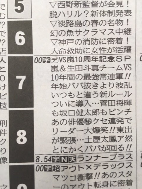 引用元: ・テレビ番組『VS嵐』のテレビ欄のラテ欄の縦読みが話題に!