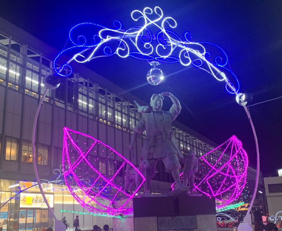 「こちらは岡山駅周辺エリアで毎年行われているイルミネーションイベント『MOMOTAROH FANTASY』の2020年版の一環です。イベント自体は1986年のスタートから今年で35回目の開催ですが、桃太郎像にもイルミネーションを付けるようになったのは10年ぐらい前からですね」