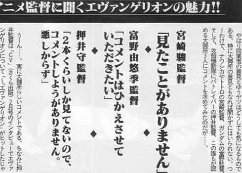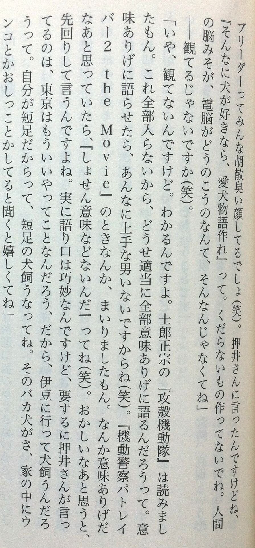 パヤオ「意味ありげに語らせたらあんなにうまい男はいないですからね。パトレイバーの時なんか参りましたもん。なんか意味ありげだなーと思ってたら『しょせん意味などないんだ』ってね。おかしいなあと思うと先回りして言うですよね。実に語り口は巧妙なんですけど。もうねそんなに犬が好きなら愛犬物語作れって話ですよ。電脳だのなんだのくだらないこと言ってないでね。自分が短足だからって短足の犬飼ってさ。でもそのバカ犬が家の中にウンコとかオシッコしてるって聞くともう嬉しくてね」