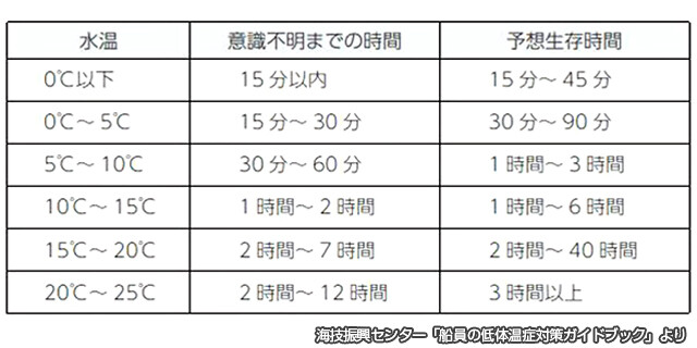 また、水温が5度から10度の場合では、30分から1時間で意識不明になり、生存できる時間は1時間から3時間程度と考えられています。