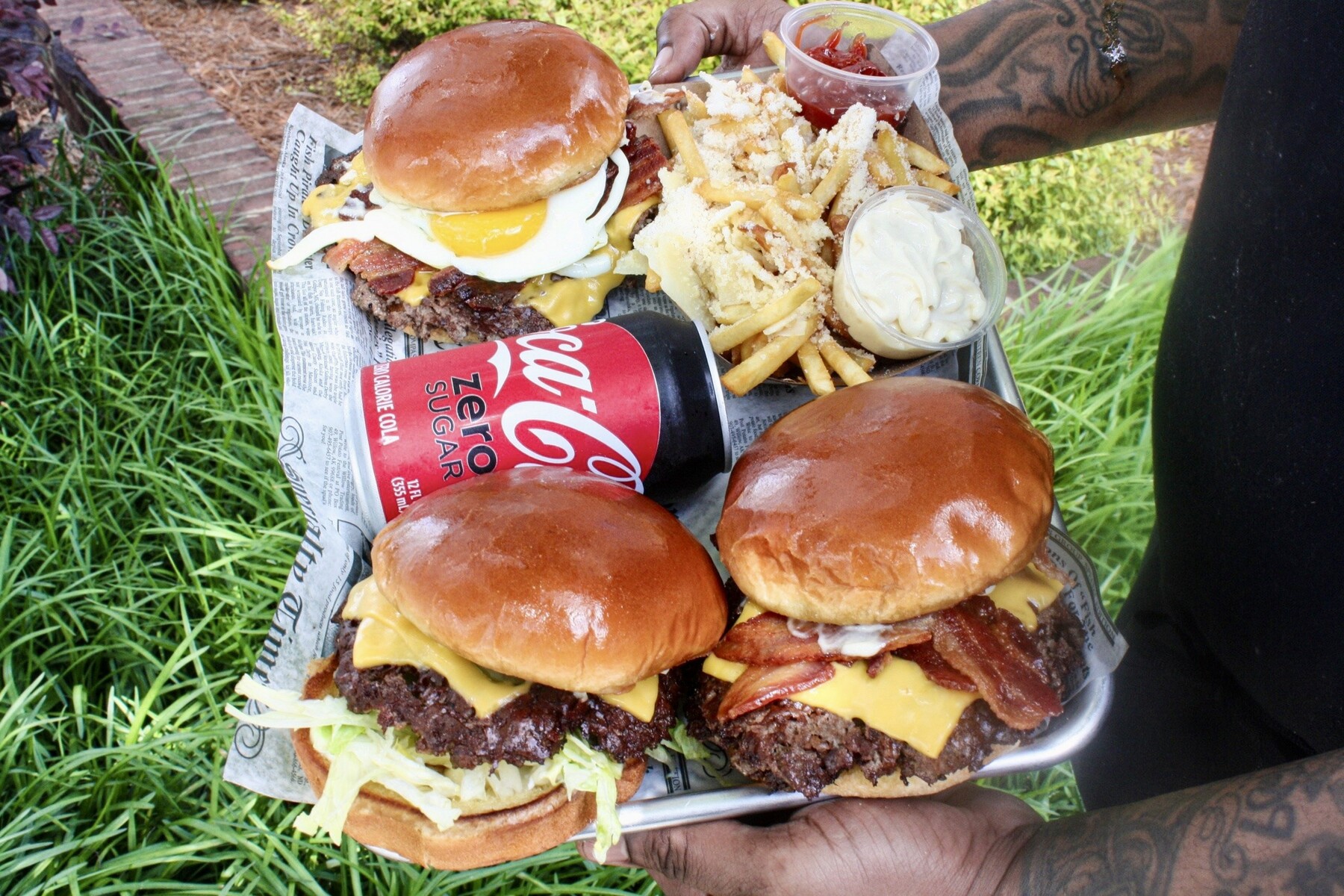 これまでにも、1キロのパティをサンドした特大バーガーなどを提供してきたが、開業20周年にちなんで2キロとした。チェダーチーズや特製スモークベーコン、自家製ピクルスやグリルオニオンとフライドオニオン、野菜もトッピングされている。