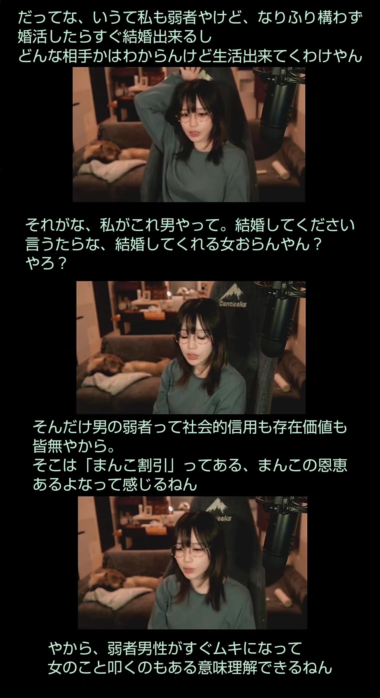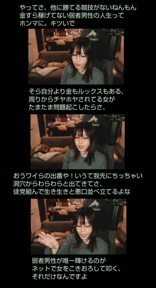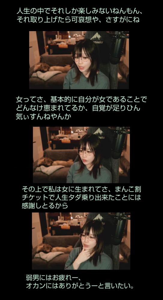 生配信を見てくれる人が誰もおらんくなったらフェミ達と一緒に「私たちは買われた」ってわめき出してお金を稼ぐ方向に転換しようと思うって言ってる