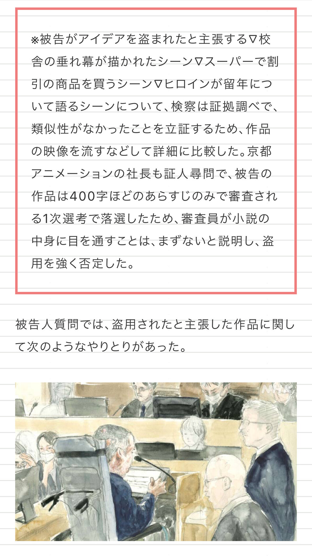 この日は遺族らに加え、一連の公判で初めて負傷者も意見陳述した。男性社員は陳述の中で、打ち合わせで被告の名前が挙がったことはなく「(会議の)参加者の中にあなたの小説を読んだ人はいない」と証言。その上で被告の主張は「思い込みだ」と強調した。