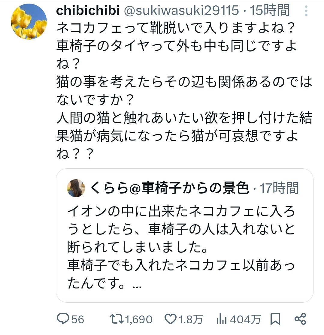車椅子の人が面白おかしく暮らすためなら猫の命はどうでも良くないか?
