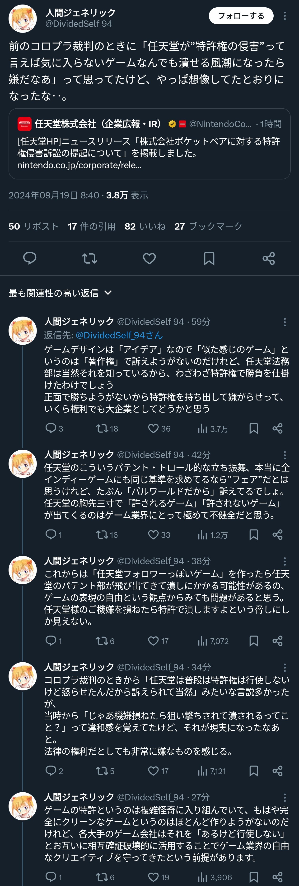 任天堂は特許を大量に保持してるからパルワールド以外にも特許に引っかかるゲームは沢山あるんだよ